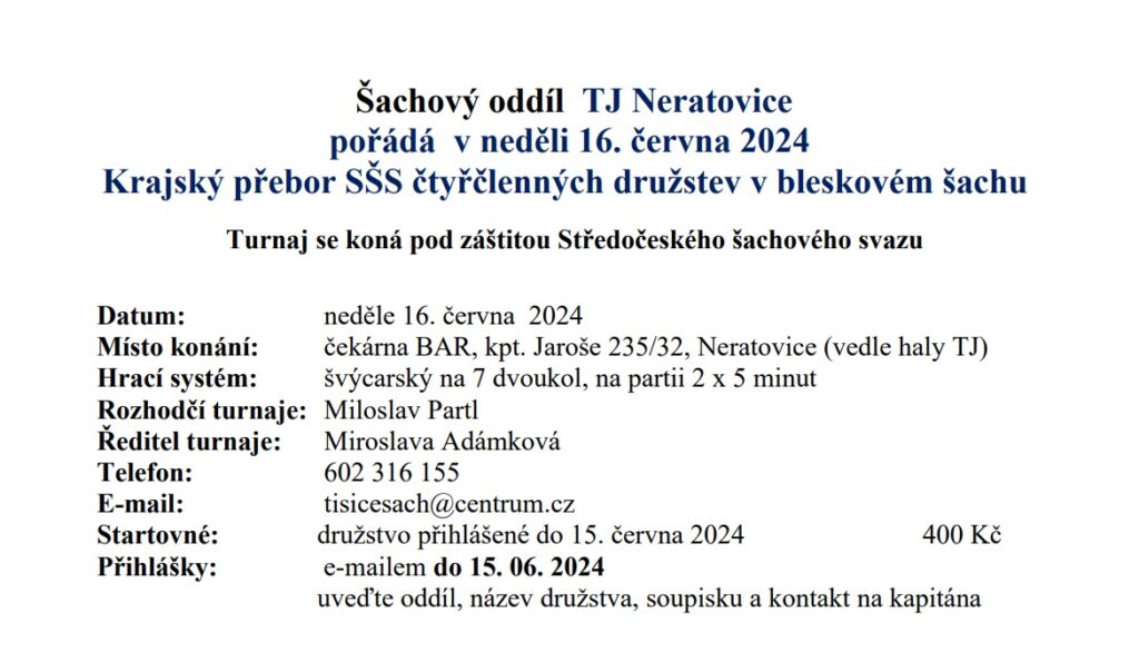 Šachový oddíl TJ Neratovice pořádá v neděli 16. června 2024 pod záštitou Středočeského šachového svazu Krajský přebor SŠS čtyřčlenných družstev v bleskovém šachu