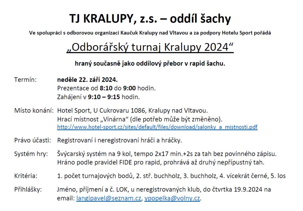 TJ KRALUPY, z.s. – oddíl šachy ve spolupráci s odborovou organizací Kaučuk Kralupy nad Vltavou a za podpory Hotelu Sport pořádá