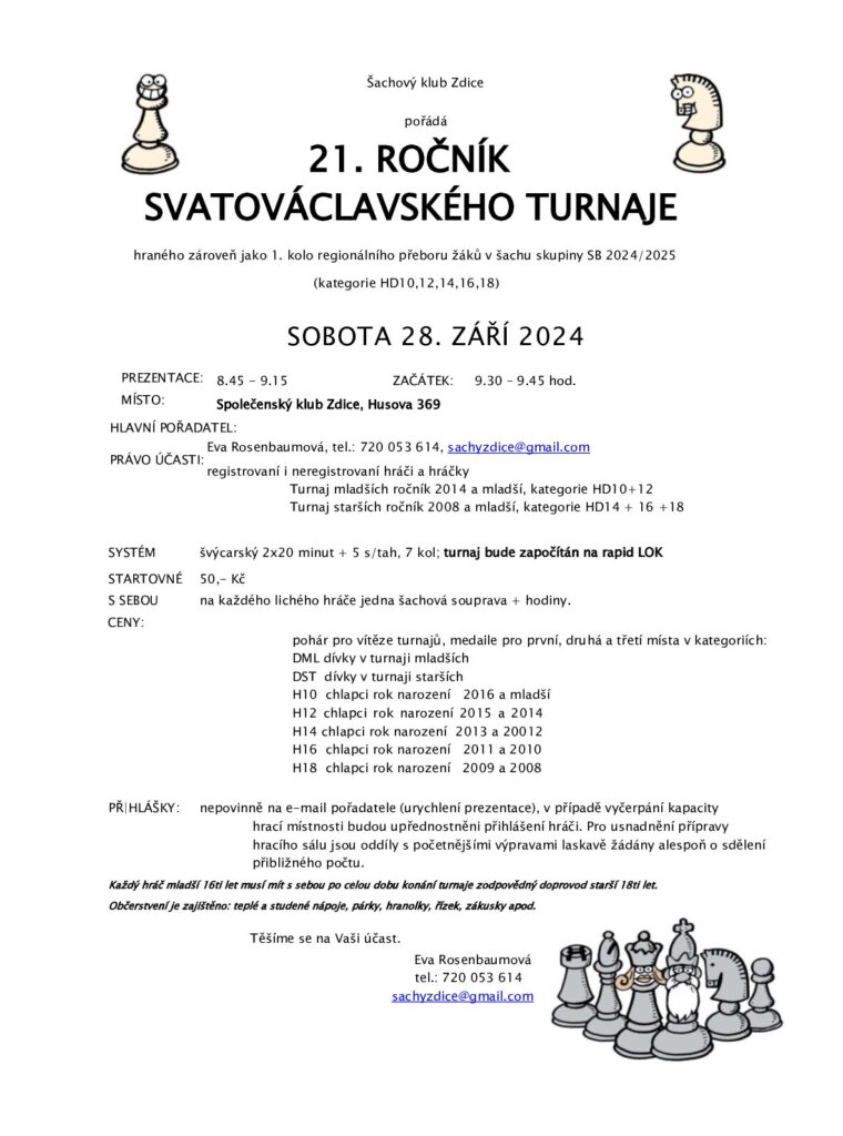 21. ROČNÍK SVATOVÁCLAVSKÉHO TURNAJE hraného zároveň jako 1. kolo regionálního přeboru žáků v šachu skupiny SB 2024/2025(kategorie HD10,12,14,16,18)SOBOTA 28. ZÁŘÍ 2024