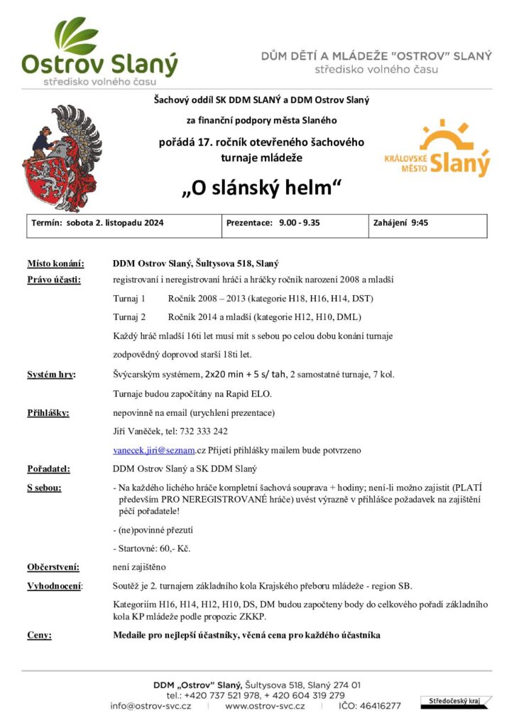 Šachový oddíl SK DDM SLANÝ a DDM Ostrov Slaný za finanční podpory města Slaného pořádá 17. ročník otevřeného šachového turnaje mládeže „O slánský helm“