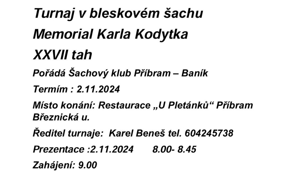 Šachový klub Příbram – Baník pořádá v sobotu 2. 11. 2024 v Příbrami (Restaurace u Pletánků) bleskový šachový turnaj Memoriál Karla Kodytka – XXVII. tah.