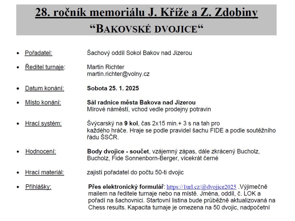 Šachový oddíl Sokol Bakov nad Jizerou pořádá 28. ročník memoriálu J. Kříže a Z. Zdobiny – turnaj “Bakovské dvojice“. Akce se uskuteční v Bakově v sobotu 25. 1. 2025.