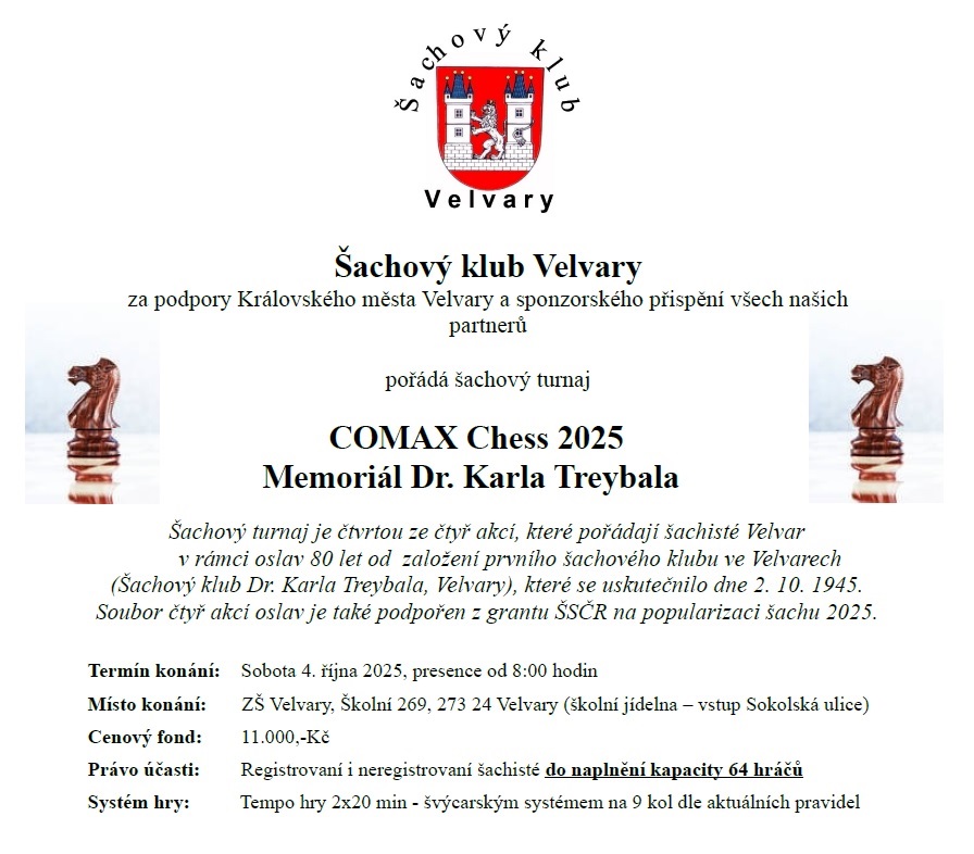 Šachový klub Velvary za podpory Královského města Velvary a sponzorského přispění všech našich partnerů pořádá šachový turnaj COMAX Chess 2025 – Memoriál Dr. Karla Treybala. Šachový turnaj je poslední ze …
