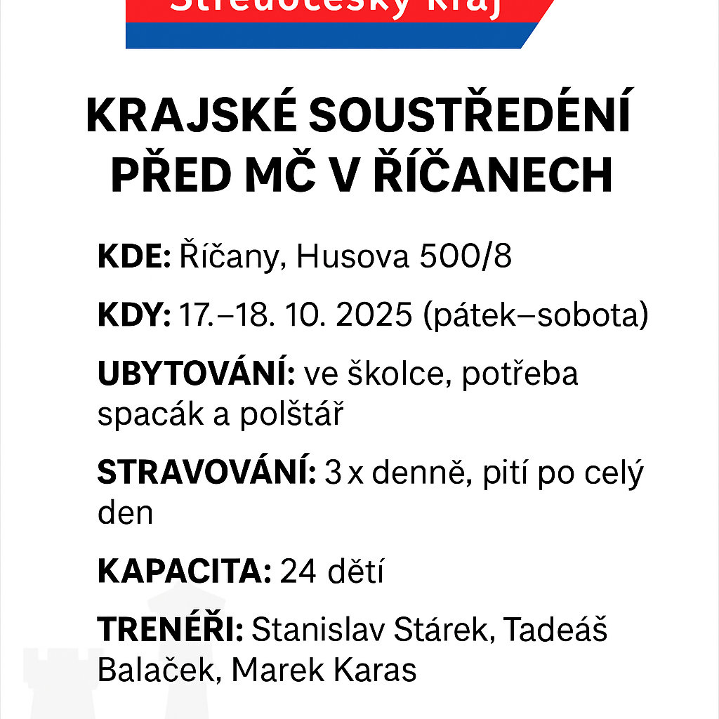 KRAJSKÉ SOUSTŘEDĚNÍ PŘED MČ V ŘÍČANECH 📍 Kde: Říčany, Husova 500/8📅 Kdy: 17.–18. 10. 2025 (pátek–sobota)🏕 Ubytování: ve školce, potřeba spacák a polštář🍽 Stravování: 3× denně, pití po celý den …