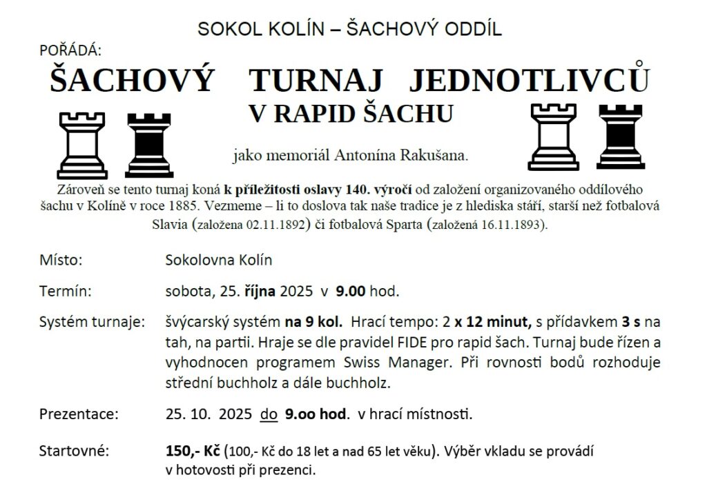 Sokol Kolín – šachový oddíl pořádá ŠACHOVÝ TURNAJ JEDNOTLIVCŮ V RAPID ŠACHU hraný jako memoriál Antonína Rakušana. Zároveň se tento turnaj koná k příležitosti oslavy 140. výročí od založení organizovaného oddílového …