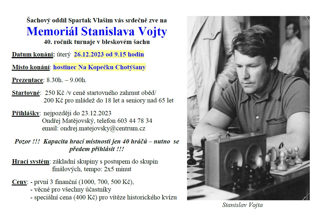 Šachový oddíl Spartak Vlašim vás srdečně zve na Memoriál Stanislava Vojty – 40. ročník turnaje v bleskovém šachu