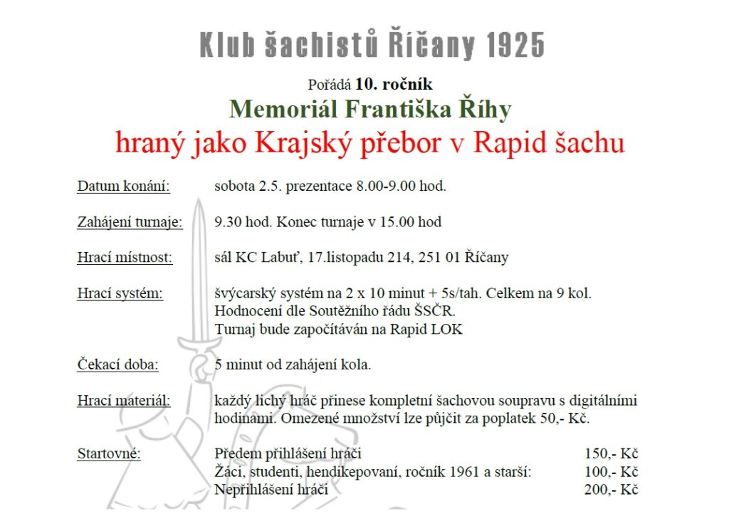 Blíže viz propozice: https://www.stcsach.cz/download/2026-05-02_propozice_kp_sss_rapid_jednotlivci_memorial-frantiska-rihy-10-rocnik-ricany/