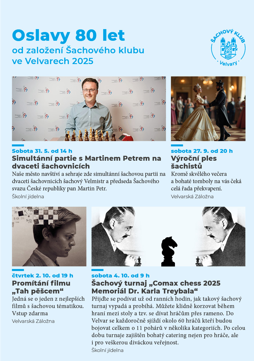 – Šachový turnaj „COMAX Chess 2025 – Memoriál Dr. Karla Treybala“; sobota 4. 10. od 9:00 hodin (Školní jídelna Velvary)