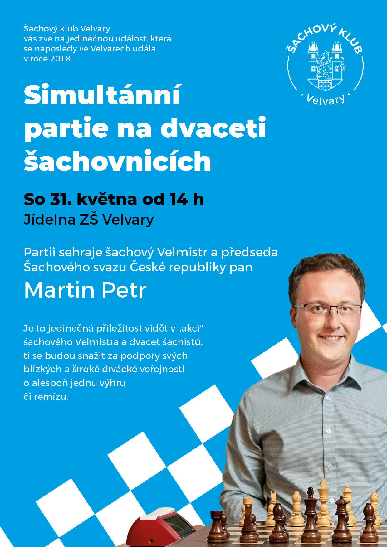 – Simultánní partie s GM Martinem Petrem na dvaceti šachovnicích; sobota 31. 5. od 14:00 hodin (Školní jídelna Velvary)